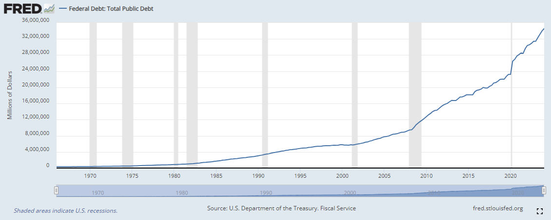 Au Q1-2024, la dette US a explosé pour atteindre près de 34 586 milliards de dollars.